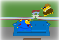 {The screen suddenly pops back to reality as Blue Laser screams. In reality he is sleeping on the couch. He suddenly wakes up.}