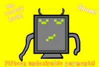 LEMMY: {voiceover} The Deleter 5000 deletes all manner of spam, junk, and Harry emails {the word "Spam!" appears in the top right corner.} with an amazing no money back guarantee. {"No money back!" appears in the top left corner.} Simply let him at your computer and your inbox will be purified in no time! All this can be yours for the low price of fifteen undesirable payments! {"Fifteen undesirable payments!" appears and flashes at the bottom.} Order now!