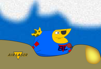 {The curtain is pushed aside to reveal a small and poorly constructed plane. It has an "Air Laser" logo and... headlights?!}