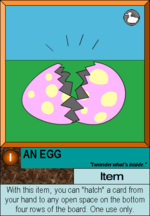 With this item, you can "hatch" a card from your hand to any open space on the bottom four rows of the board. One use only.