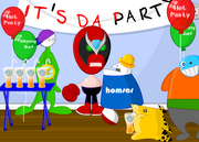 {Then there is a flash of white light before it fades to the party room, where Coach Z is talking to Strong Bad (nodding at an interval) and Bubs is talking to The Cheat (holding a glass of Thai iced tea). There is a blue table with four more glasses of Thai iced tea, and there are red balloons that say "Hot Party" and green balloons that say "Strong Bad." Then Homsar dawdles to the scene as all attention is drawn to him.}