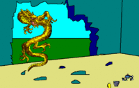 {The dust clears to reveal a yellow, giant, japanese dragon.}