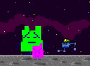{Cut to the lunar surface. Chorch Commander is here along with the two Mooninites Ignignot and Err. They are pixelated creatures, Ignignot is larger and green while Err is smaller and purple, but they both are pretty small compared to Chorch Commander.}