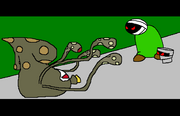 {Cut back to the desert. The guys are lying on the ground, hungry with the exception of Kyle and Ben. Marzichan looks at Stinkoman and sees a chicken with blue hair. The Unguraits see Contestro as a bag of Delicious "Bag" with sunglasses and a red cap. Stinkoman sees the Unguraits as prawns with bandages on. Contestro 1-Up as a glass bottle with a cap. After about 6 seconds, they start to attack each other. Just then, the portal opens. They quickly jump in. After they do so, Possessed Squid and Master X come out.}'