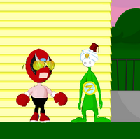 {Cuts to a scene behind Cutesy Buttons' house. Dangeresque and Renaldo creep in from the side.}