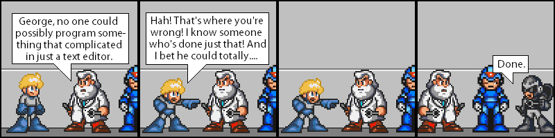 Now in case you don't know this, I didn't draw those two tools that Mechanic Joe is holding. No... I ripped those from a comic in Bob And George. Fortunately for me, I didn't have to do any searching for them, because I already had used them in a custom comic. What's a custom comic? Well, it's something some BnG-ians do on the forums, where they take a BnG comic and edit it. I made two of these, the first of which featured the tools I need. (You might now get the jokes entirely if you don't read BnG)