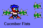 Stinkoman acquires the Cucumber Fists after defeating Crack Greggo. These gloves give Stinkoman double his strength when he punches. They affect living enemies more than robot enemies because of their increased "Stabbiness Power". Although these gloves increase his power and strength, he is unable to perform special attacks such as throwing his fire punches or performing a Double Deuce.